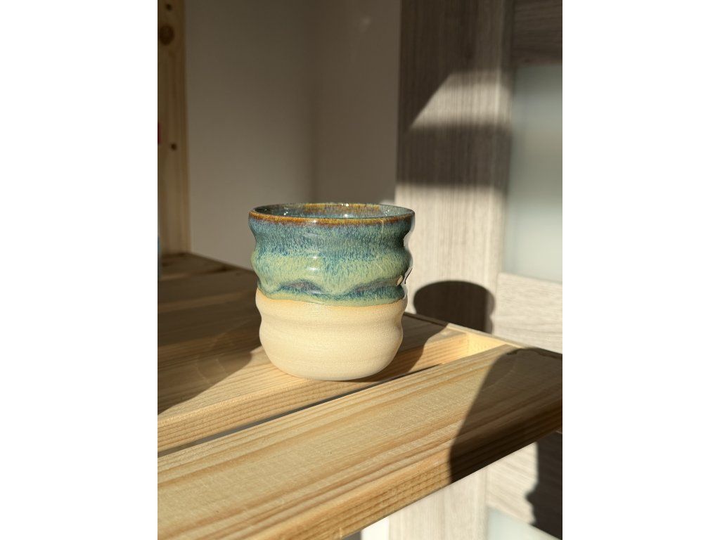 Kalíšek vytočený na hrnčířském kruhu, vypálený za vysokých teplot.