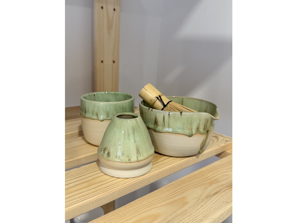 Matcha set, který se skládá z misky (chawan), stojánku na chasen a kalíšku o objemu cca 240 ml.
